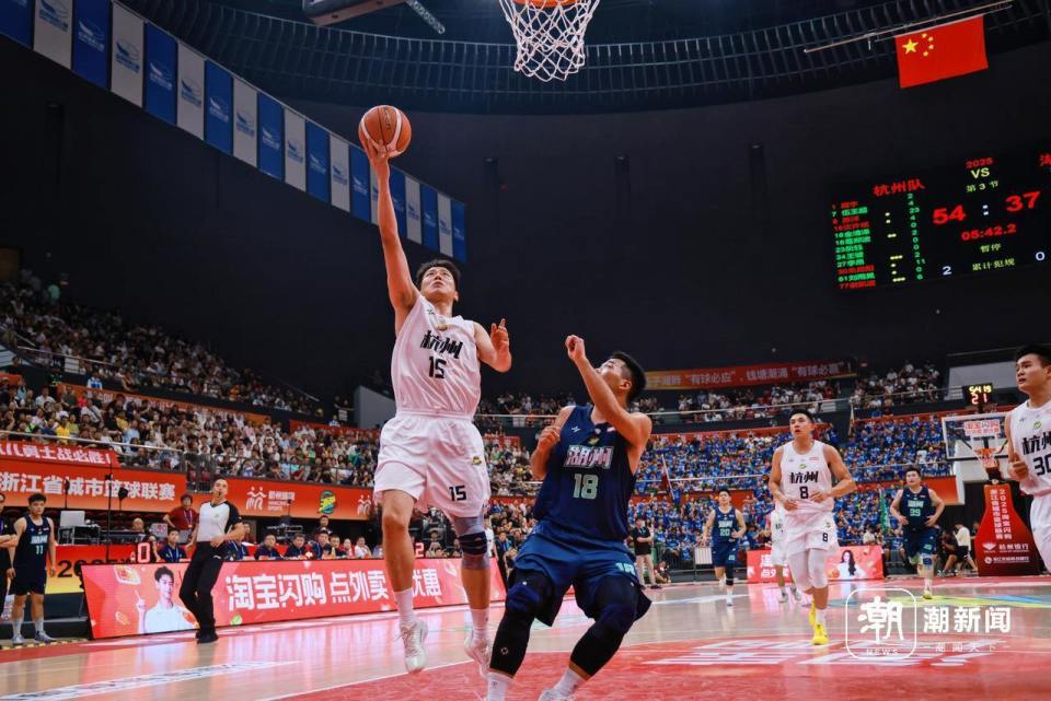 上一轮获得全队最高22分的赵哲轩本场比赛缺席,已经开学的他正在代表宁波大学征战“海峡两岸大学生篮球赛”,但是杭州队的进攻火力不减。在首节和对手打得不相上下的情况下,第二节杭州队队长陈洋率先发力,一口气连得7分,率领球队在第二节打出一个24-8的小高潮,一举将分差拉开到了两位数。陈洋自己在半场就砍下20分,无愧杭州得分王的称号。